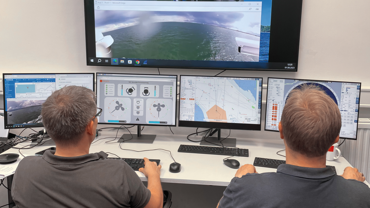 The shore control centre is equipped with a large monitor on which camera systems display a 360˚ view in real time, similar to a ferry. Multifunctional monitors display navigation radar and electronic nautical chart and navigational data.
