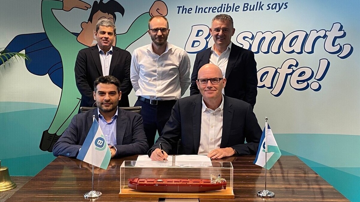Berge Bulk chief executive James Marshall and ABS vice president of global sustainability Panos Koutsourakis signed the joint development project (JDP) agreement which will see the companies explore the possibility of retrofitting the 300-m heavy fuel oil-propelled bulk carrier Berge Mauna Kea to operate on methanol fuel