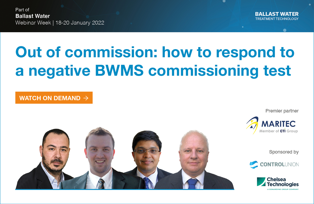 In the third Riviera webinar of 2022, Out of commission: how to respond to a negative BWMS commissioning test, a group of experts comprising of CTI Maritec EU area business development manager Andreas Lougridis; Chelsea Technologies sales and business development manager Michael Haraldsson; Control Union Certifications project manager and ballast water testing expert Cees van Slooten; and Lloyd’s Register principal specialist Sahan Abeysekara discussed the implications of the amendments to regulation E-1 of the Ballast Water Management Convention (BWMC) adopted by MECP 74, which requires biological efficacy testing when commissioning a ballast water treatment system on board a vessel.