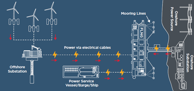 Future-ready FLNG players are exploring external power sources such as shoreside utilities, onshore generators, power service vessels and offshore windfarms to power installations to curb greenhouse gas (GHG) emissions and significantly cut costly offshore fuel dependency.