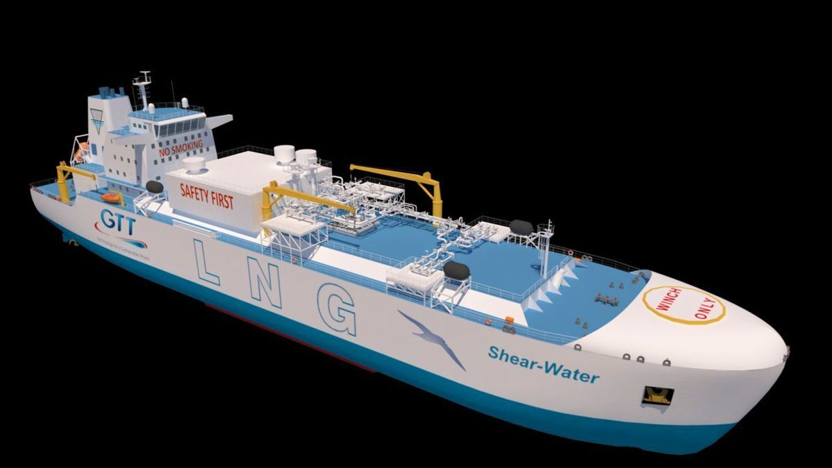 The concept, called Shear-Water, has received approval-in-principle (AiP) from both the China Classification Society (CCS) and DNV. The LNG bunker ship incorporates a large bilge keel and a Flume anti-rolling tank supplied by German engineering firm Hoppe Marine. This Flume roll-damping tank is designed to operate at maximum efficiency when the vessel is empty, where rolling might be most severe. It can also be operated at design draft conditions with slightly less efficiency.