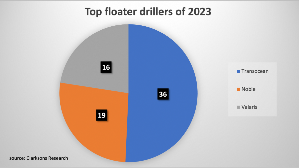 NYSE-listed Transocean is the largest floater driller with 36 units, followed by Noble (19) and Valaris (16). The largest floater operator is Brazil’s Petrobras, with 22 units, followed by China’s CNOOC (12) and Dutch-Anglo Shell (11).