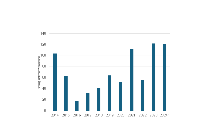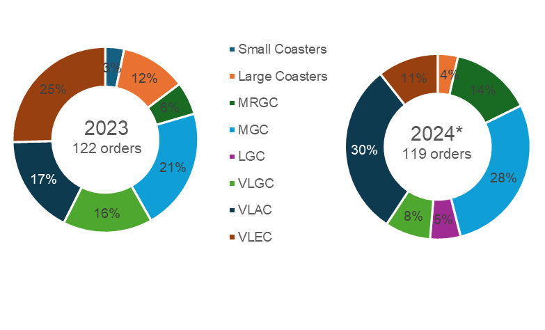 MGC orders have skyrocketed this year and now stand at a record high of 34 orders; just like VLACs, the momentum from 2023 has rolled into 2024. MGCs offer versatility to shipowners as they can be used for LPG, ammonia and olefins/ethane (specialised carriers). The segment has an orderbook with 63 vessels, accounting for 45% of the current fleet.