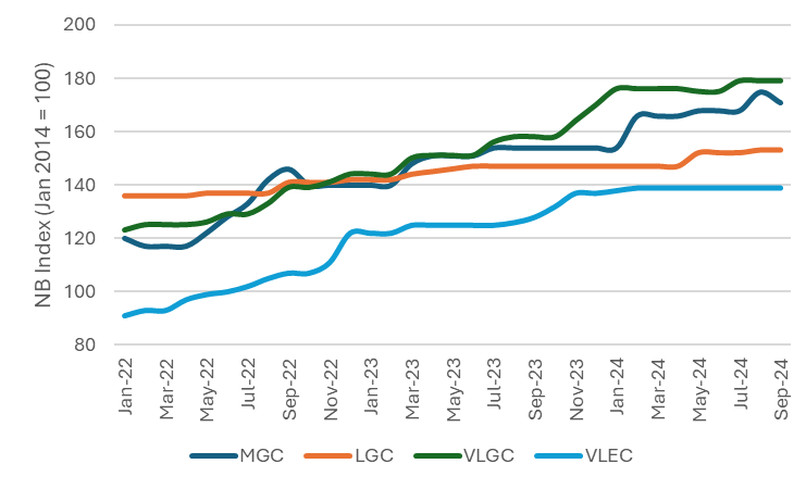 Newbuilding activity has been expanding, with 126 orders placed as of the end of September 2024 compared to 122 vessels ordered in 2023. The surge is primarily driven by the interest in very large ammonia carriers (VLACs) and very large ethane carriers (VLECs), while other segments also report record orders. Drewry has analysed the key factors supporting this uptick in orders.