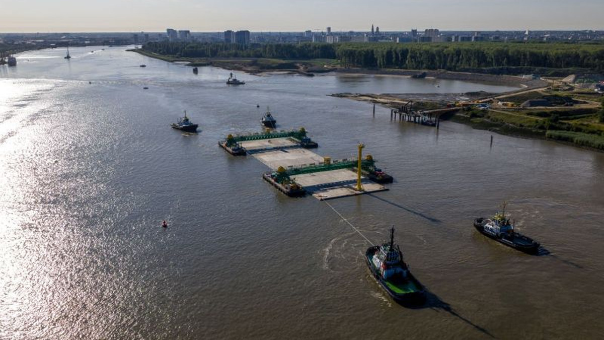 Tugboats are supporting the construction of a motorway tunnel in the River Scheldt in Antwerp by towing and manoeuvring concrete structures and assisting in their installation