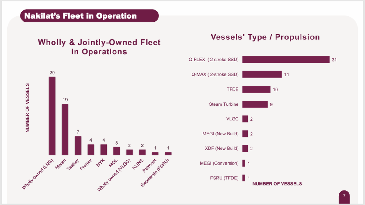 The investor presentation set out Nakilat’s view of fleet mix by vessel type and propulsion, listing 31 Q-Flex LNG carriers with two-stroke slow-speed diesel propulsion and 14 Q-Max LNG carriers with two-stroke slow-speed diesel propulsion, alongside 10 tri-fuel diesel-electric units and nine steam-turbine ships. It also listed two very large LPG carriers, two MEGI newbuilds, two XDF newbuilds, one MEGI conversion and one FSRU with tri-fuel diesel-electric propulsion.