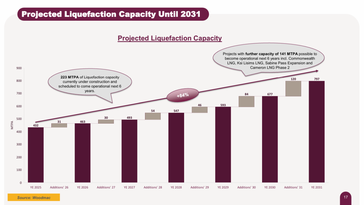 In its medium-term outlook slides, Nakilat cited Wood Mackenzie projections of global liquefaction capacity rising from 432M tonnes per annum (mta) in the year ending 2025 to 797 mta by the end of 2031, and linked the increase to higher LNG transport requirements.