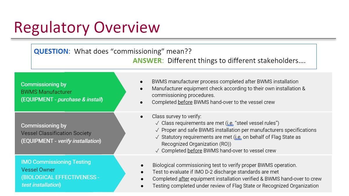 There is still a lot of confusion concerning the purpose of the different sorts of commissioning that take place in the ballast water management system industry and one of the aims of the Vessel operators’ new and continuing BWMS installation and testing obligations webinar* that took place 31 January 2023 was to dispel some of the myths.