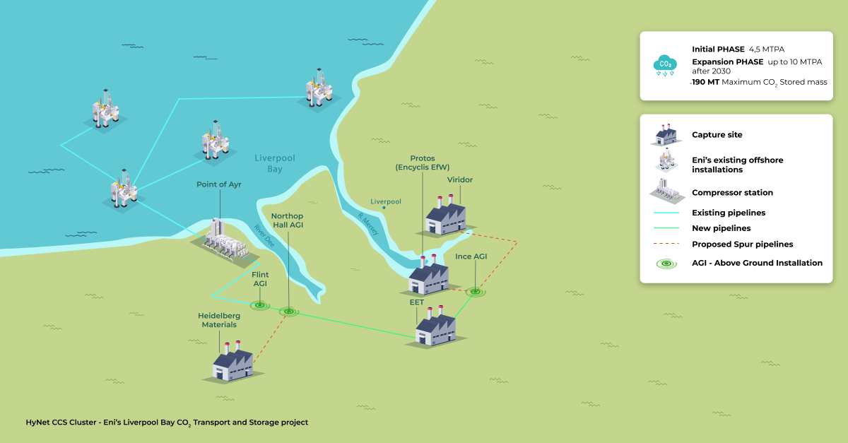 Phase one of HyNet is designed to store 109M tonnes of CO2 in the East Irish Sea, 32 km off the coast of Liverpool, over 25 years.