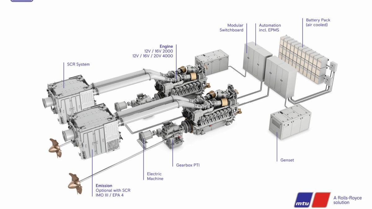 Rolls-Royce’s mtu Hybrid PropulsionPack for its series 2000 and 4000 engines that will become available from next year will combine diesel engines with electric propulsion modules, batteries, gear boxes and control and monitoring systems.