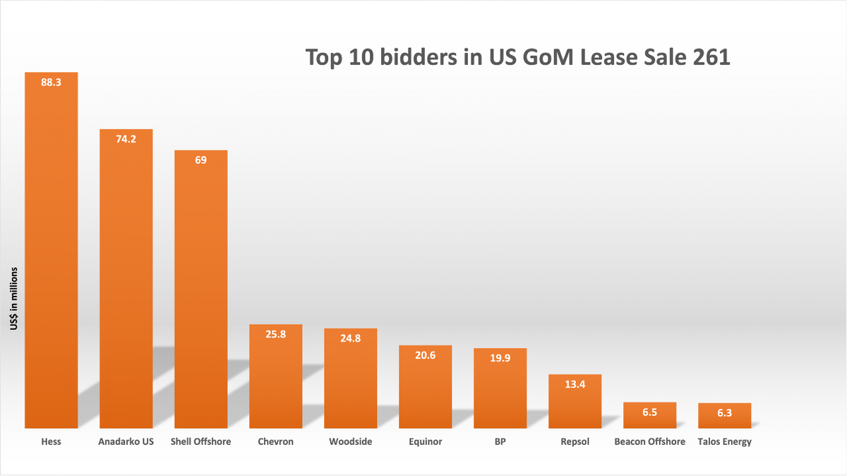 With seven of the top 10 high bids, Anadarko and Hess dominated the Gulf of Mexico Oil and Gas Lease Sale 261, which overall amassed US$382.2M in high bids—the majority of which were for ultra-deepwater and deepwater tracts