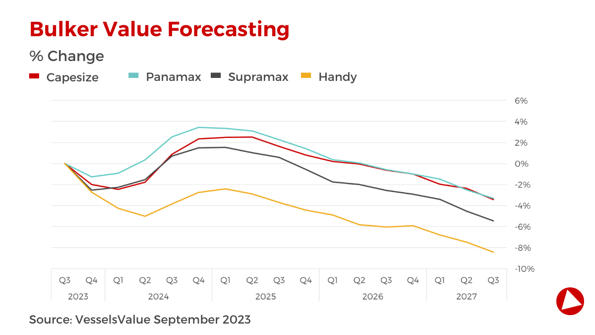 In its latest Shipping Market Outlook - End Q3 2023 Forecast Values, VesselsValue reported the bulker industry is expected to witness a positive outlook, driven by various factors shaping the global trade landscape.