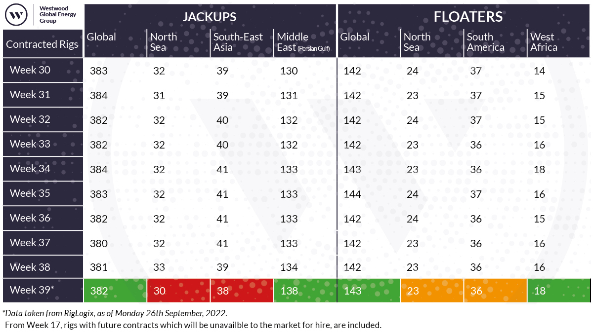 In week 39, the number of active rigs continues to hold across both jack-ups and floaters. While North Sea jack-ups declined by three units, the Middle East Gulf added four more rigs. Floaters remained relatively unchanged, according to the latest data from Westwood Global Energy Group