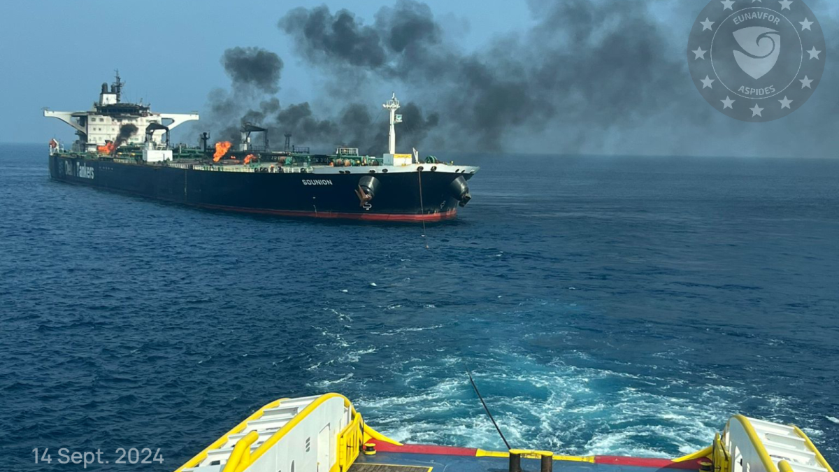 The European Union’s (EU) combined, French Navy-led operation Aspides is providing updates on the Suezmax vessel Sounion that was repeatedly hit in Houthi attacks on 21 August.