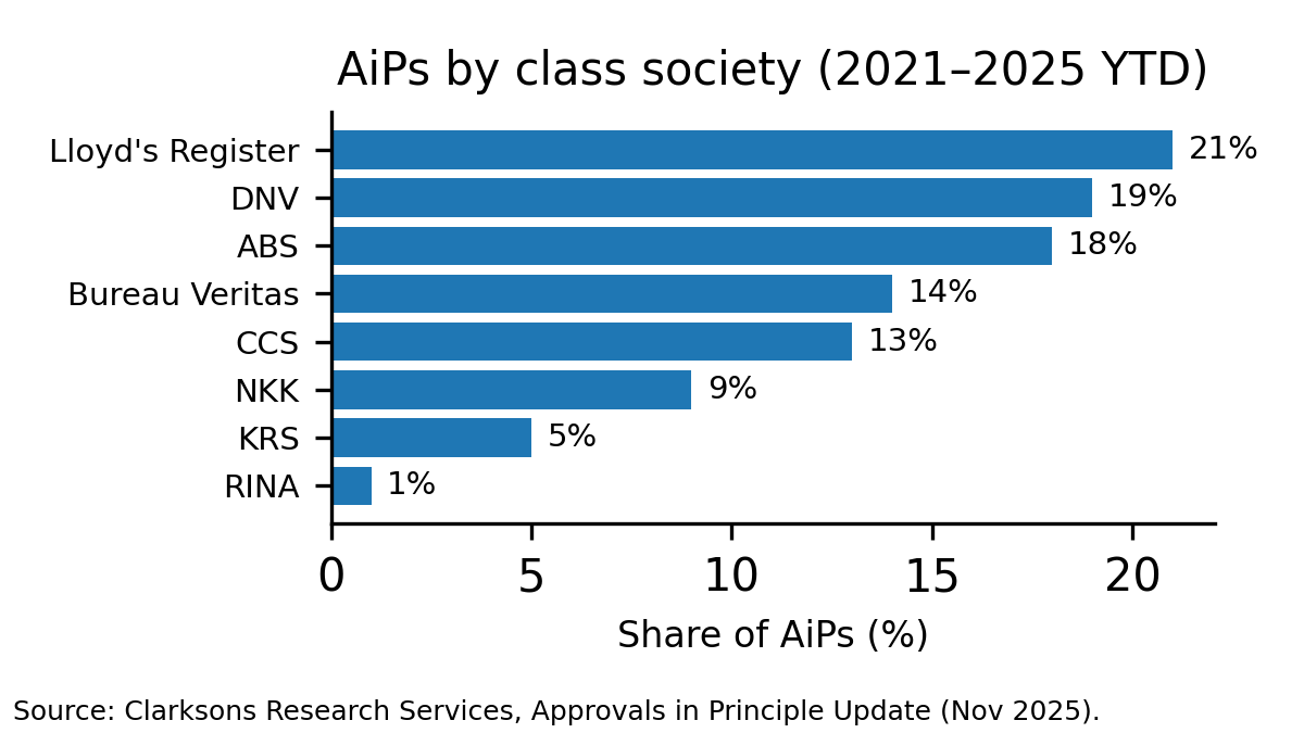 Clarksons’ breakdown by class society attributed 21% of 2021–2025 year-to-date AiP designs to Lloyd’s Register, 19% to DNV, 18% to ABS, and 14% to Bureau Veritas.