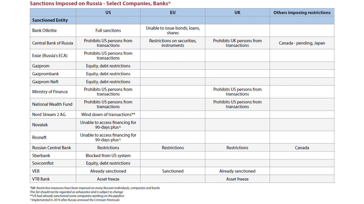 Restrictive measures have been applied by the US, EU, UK and others on a wide range of Russian companies, banks and individuals. In addition to sanctions, they include a plan to ban some yet unnamed Russia banks from the Society for Worldwide Interbank Financial Telecommunication (SWIFT), which is a messaging system that banks use to make cross-border payments.